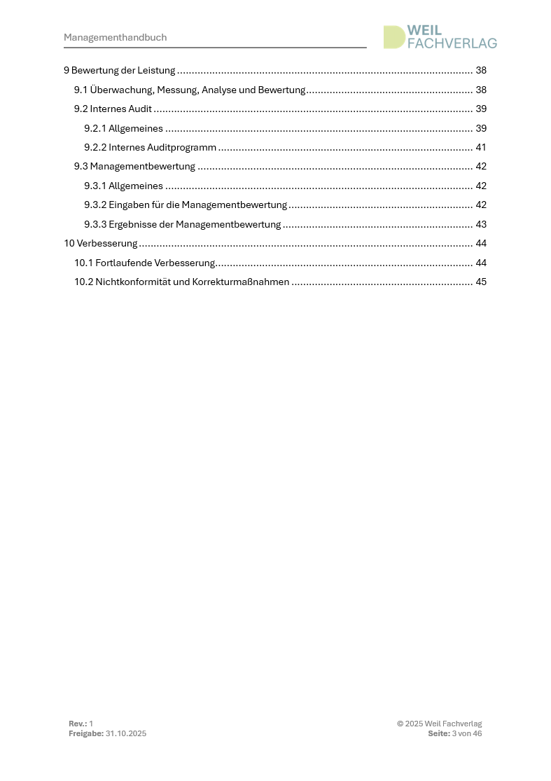 Anstatt jedes Dokument mühsam selbst zu entwickeln, erhalten Sie ein sofort nutzbares Komplettpaket, das sich in der Praxis bei Unternehmen, Behörden und Dienstleistern seit Jahren bewährt hat. Alle Vorlagen sind klar aufgebaut, logisch verknüpft und entsprechen der neuen High-Level-Structure (HLS).