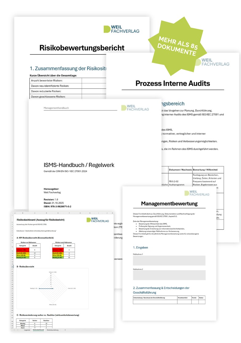 Über 85 sofort einsetzbare Vorlagen, bestehend aus vollständigem ISMS-Handbuch, Prozessanweisungen, Arbeitsanweisungen, Formularen, Checklisten und Berichtsvorlagen – vollständig normkonform zur ISO/IEC 27001:2024.